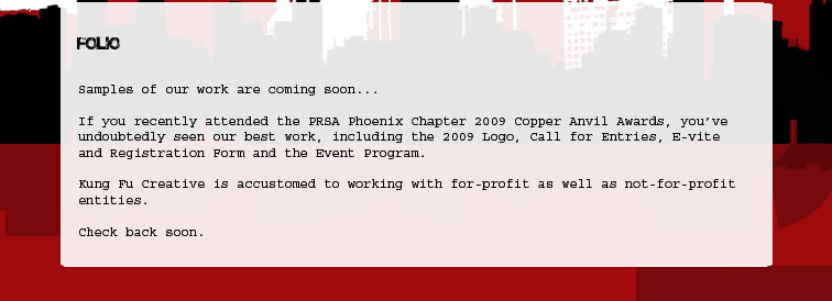 Phone 480.282.3063 | Fax 480.456.3096 | Kung Fu Creative, LLC © 2009 | Terms of Use | Privacy Policy